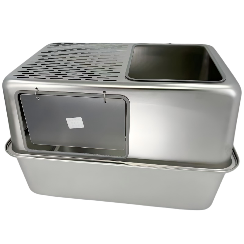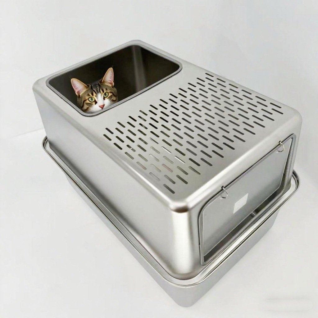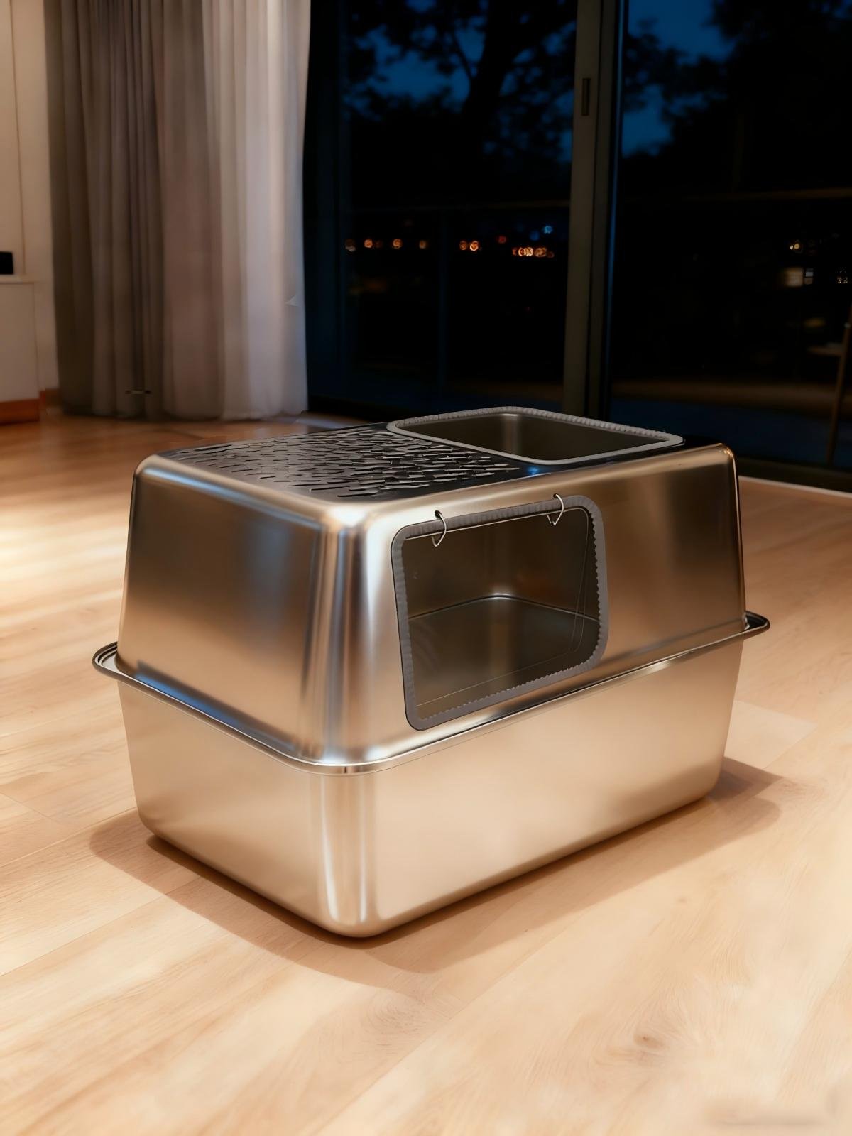 Tired of flimsy, hard-to-clean litter boxes? Meet our premium stainless steel cat litter box: no snaps, no plastic—just durable, rust-proof metal built to last.Its seamless, tool-free design lets you customize entry shapes (cut to fit your cat’s preference!) while the grated top + deep tray contain messes. Non-porous surface wipes clean in seconds (no lingering odors!)—perfect for messy kitties & easy upkeep.