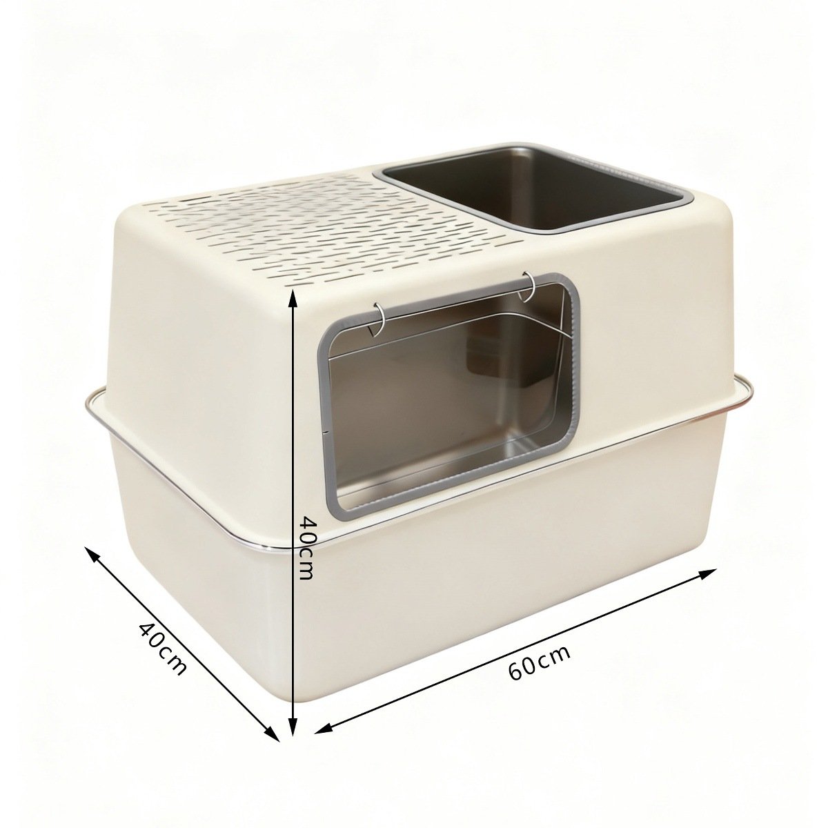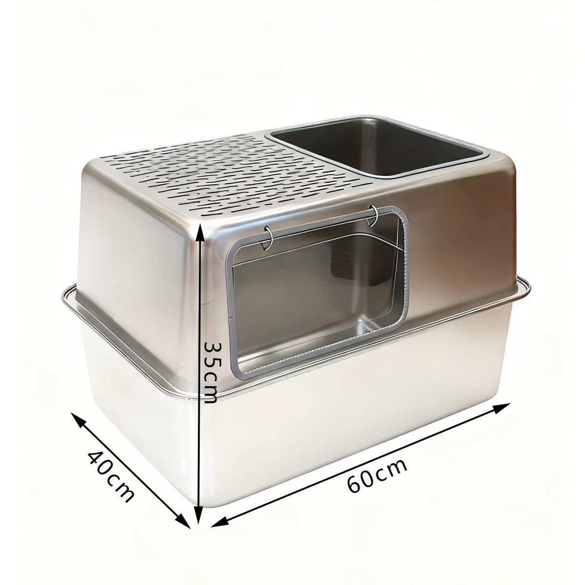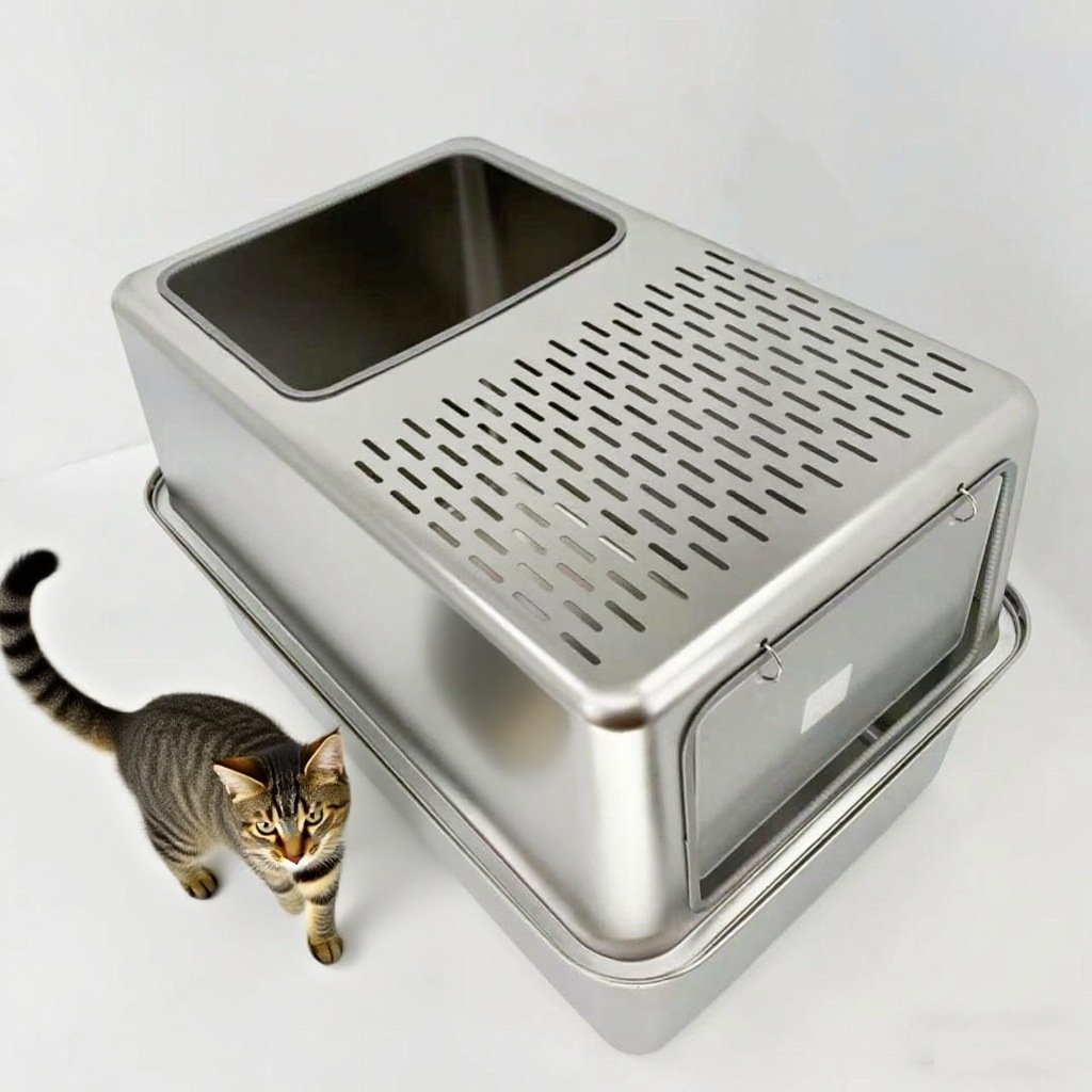 Tired of flimsy, hard-to-clean litter boxes? Meet our premium stainless steel cat litter box: no snaps, no plastic—just durable, rust-proof metal built to last.Its seamless, tool-free design lets you customize entry shapes (cut to fit your cat’s preference!) while the grated top + deep tray contain messes. Non-porous surface wipes clean in seconds (no lingering odors!)—perfect for messy kitties & easy upkeep.